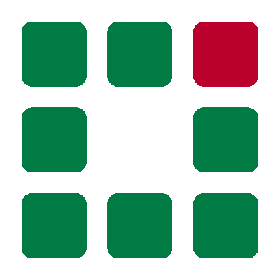 シンボルマークは均一に並んだ8つの角丸四角形で構成されます。深緑色のシンボルカラーの四角形が並ぶ中,最右上の四角形だけ,紅色のシンボルカラーを採用しています。